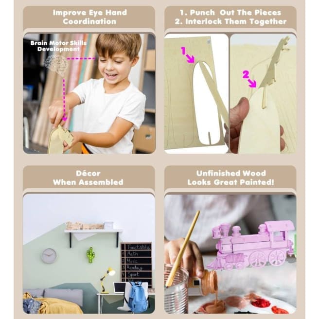 This 233 piece Train wood craft construction kit is a fun & educational DIY 3D puzzle to build & paint or keep in natural wood.