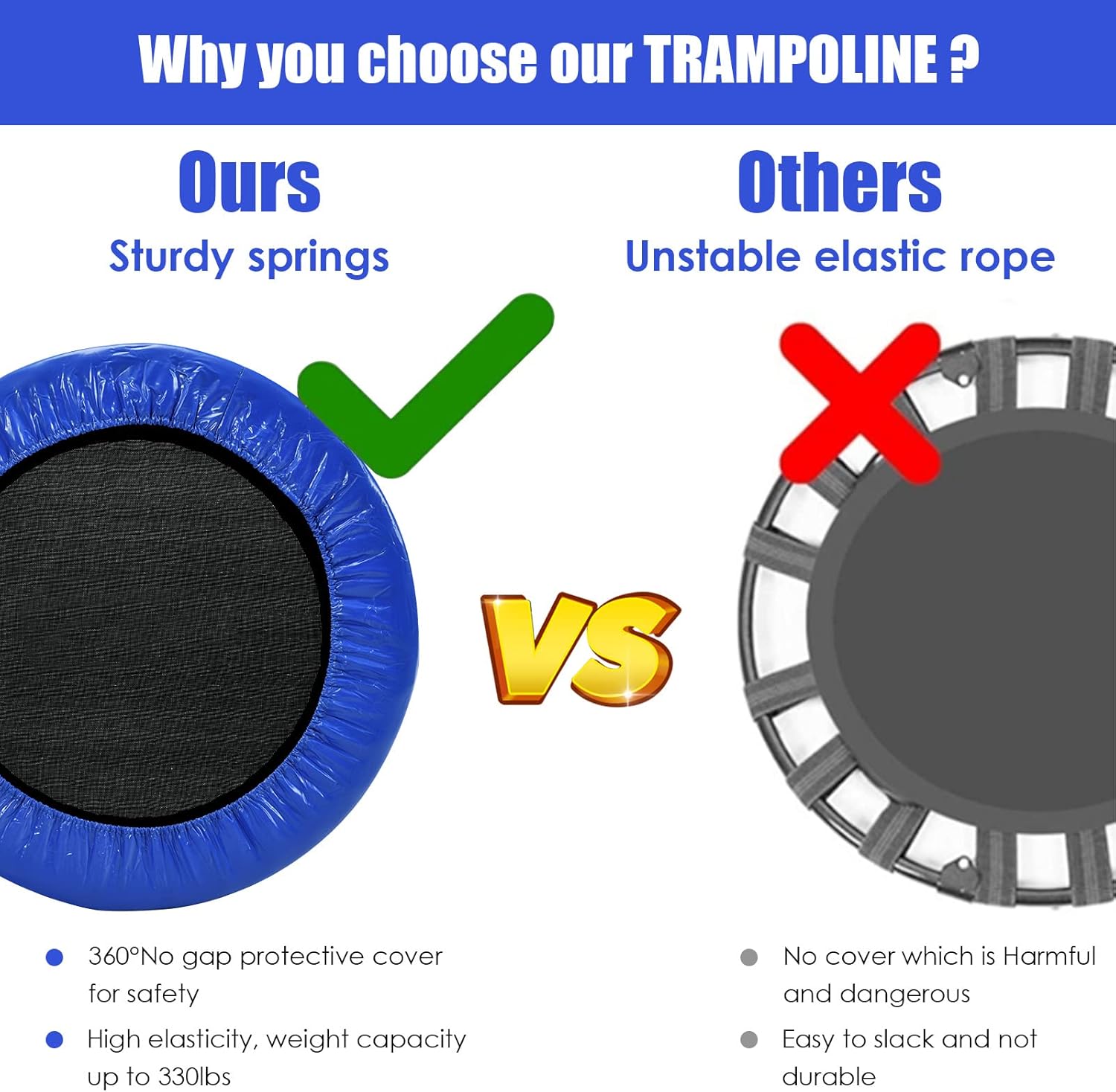 -Non-Slip and Amazingly Quiet in Use:With unique design to improve the rubber caps and bounce mat, mini trampoline bouncer will be well kept in place and providing more stable and safer bouncing experience and thus also makes it possible for kids age 10+, under adults guardianship, to do cardio workout. It also effectively reduce noises by optimizing the trampoline mat.