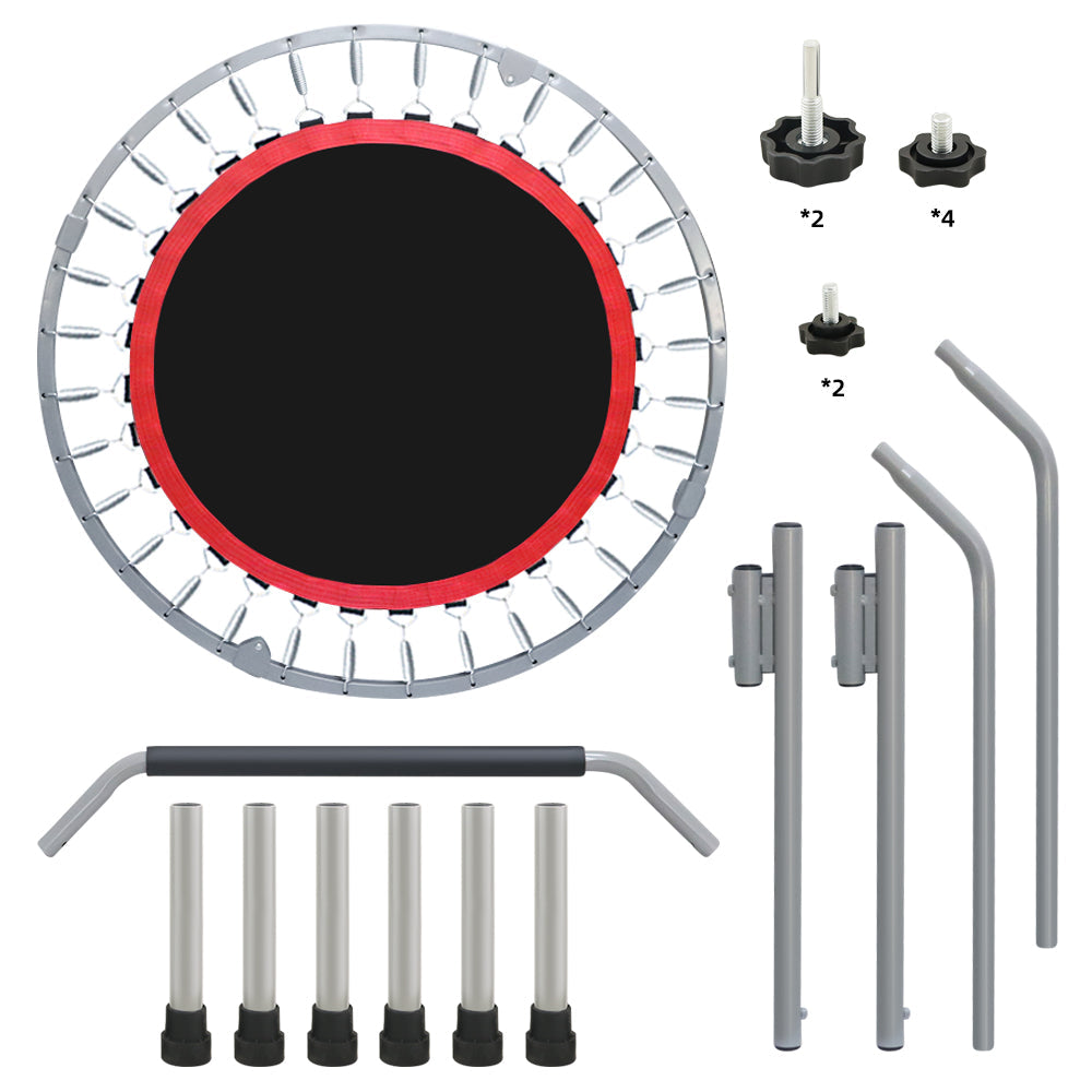 HIGH QUALITY - The exercise trampoline is made of high-quality steel tube and polypropylene stretch fabric, which is durable and not easily deformed. Stretch fabric covers the spring in all directions to prevent foot injury. The trampoline adopts a drum spring that is more elastic and less prone to breakage than the webbing.