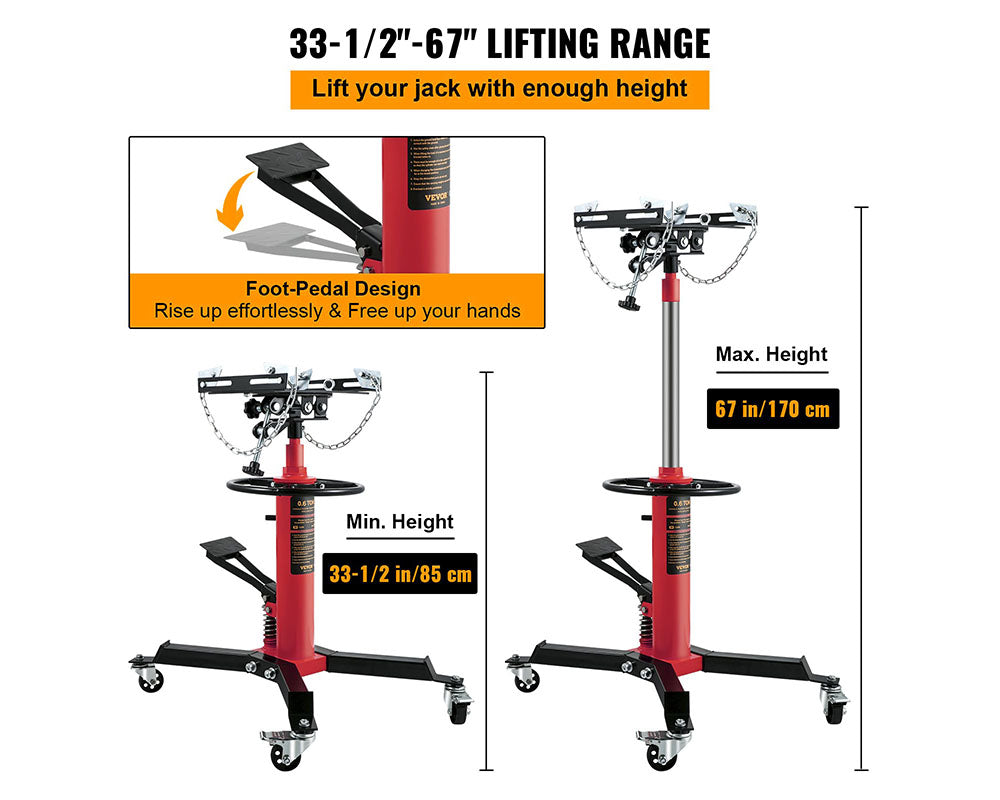 This 2-stage hydraulic telescoping transmission jack is designed to securely guide transmissions during installation or removal. With a capacity of 1322 lbs to 1660 lbs (600 kg to 750 kg), it is ideal for automotive and light truck tasks.33-1/2" to 67" (85 cm to 170 cm) Lifting Range: