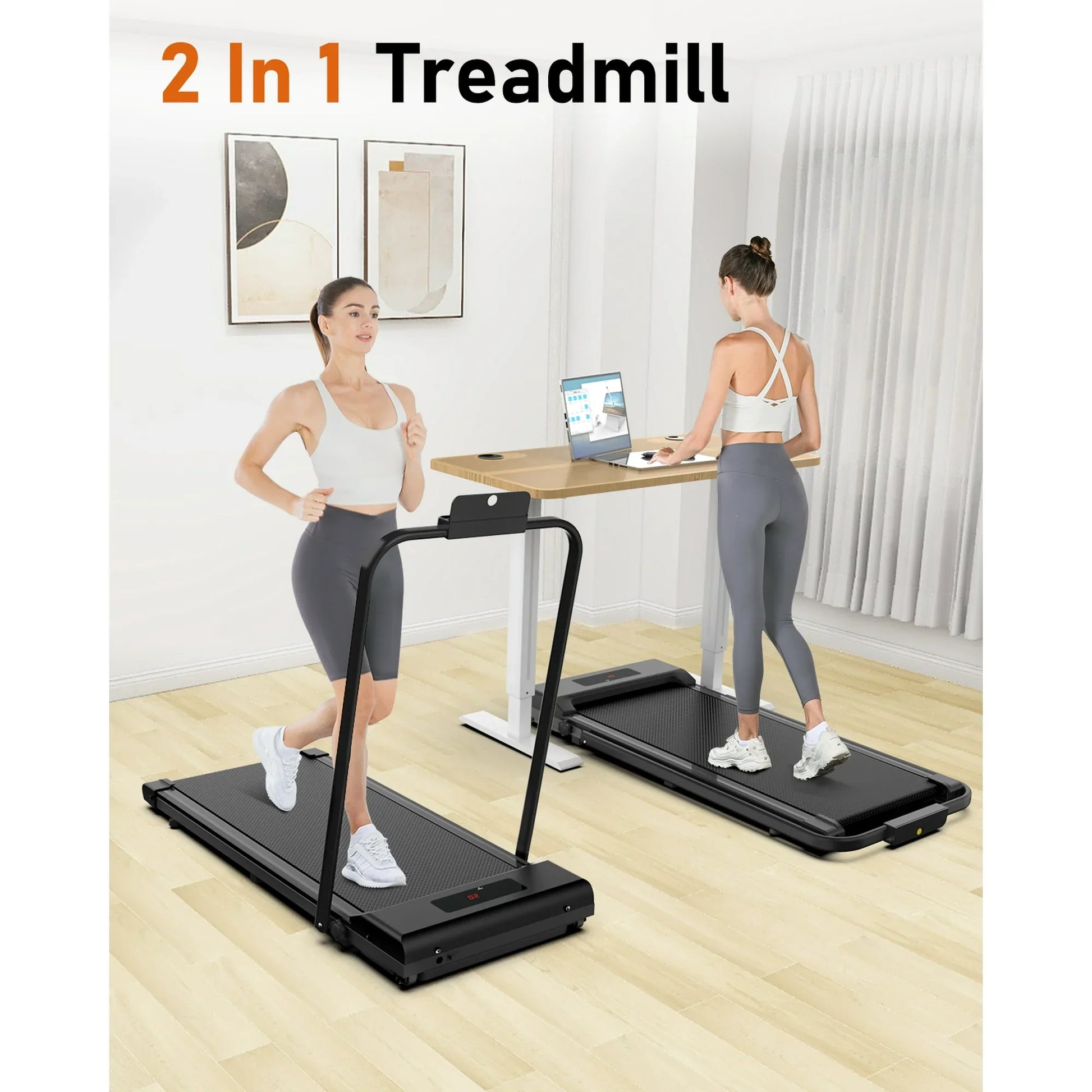- 2-in-1 Treadmill Functionality: Switch easily between under-desk treadmill walking mode (1–5 km/h) and treadmill jogging mode with handles (5–10 km/h).