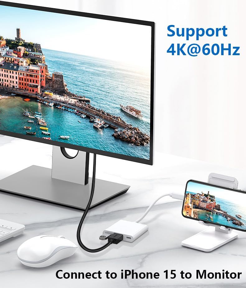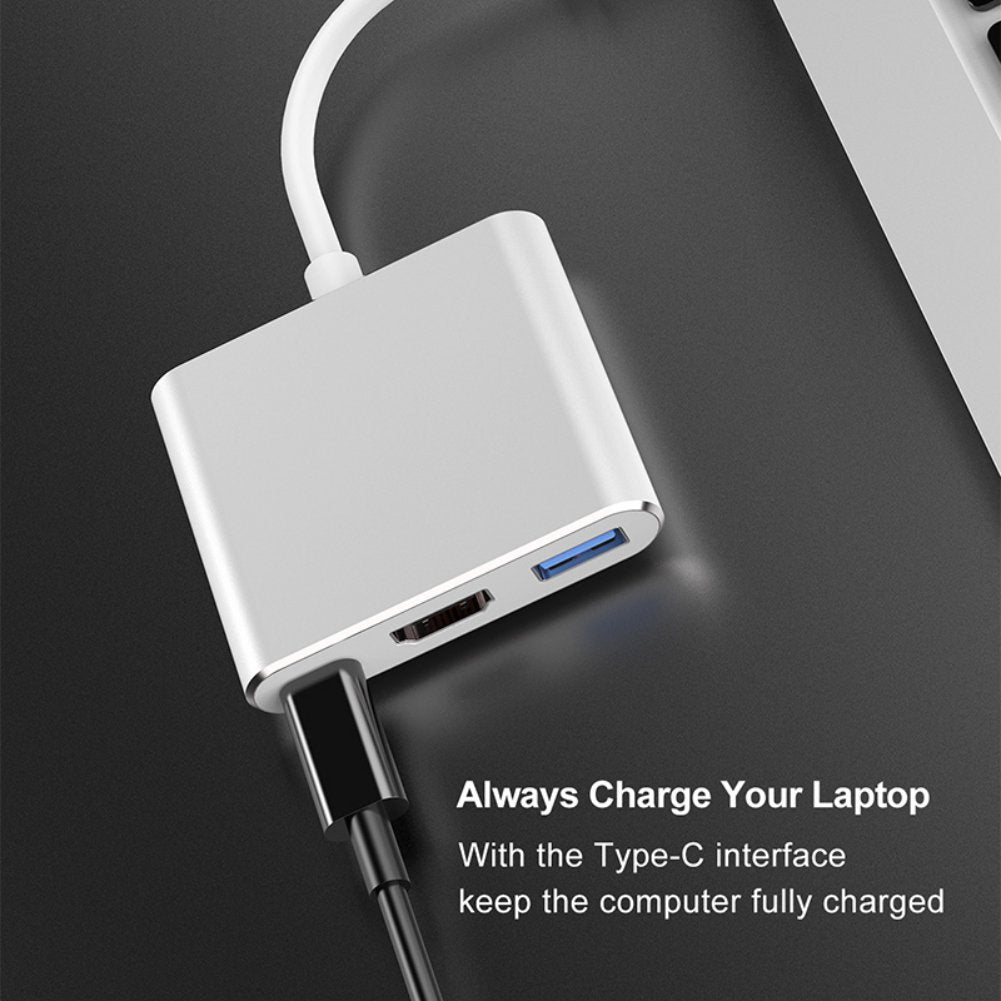 USB C to HDMI 3 in 1 Multiport Adapter, HDMI to USB C expand one USB-C port to HDMI 4K@30hz output port, a USB-C 100W power charging port and a USB3.0 port. All ports can be used simultaneously