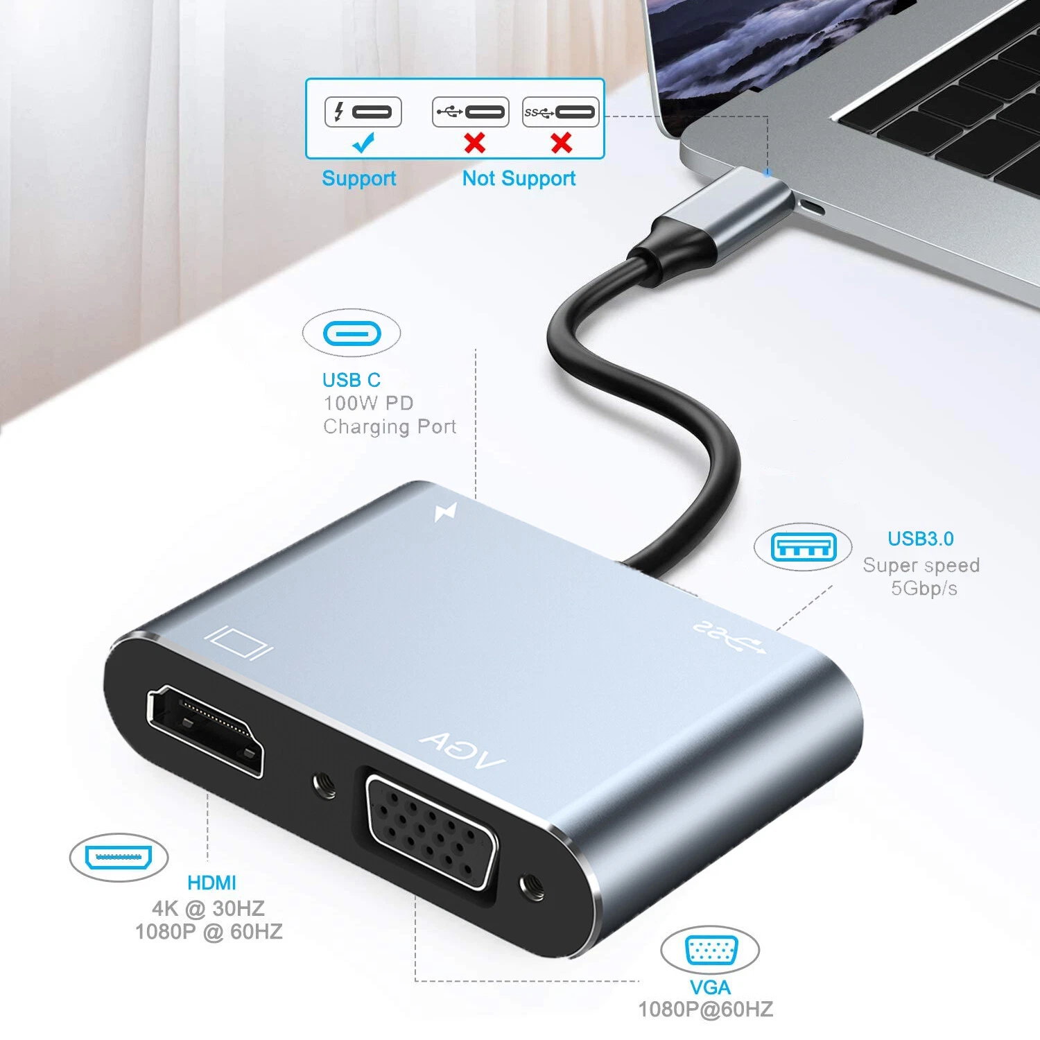 - 4-in-1 functionality: HDMI, VGA, USB 3.0, and USB C PD charging