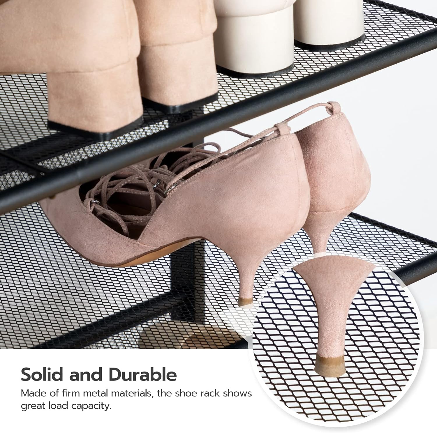 - Holds More Shoes: This 4-tier Shoe Rack is designed to hold 12-15 pairs of shoes on its 3 mesh shelves plus the top board, perfect for everything from flats to heels and high tops.
