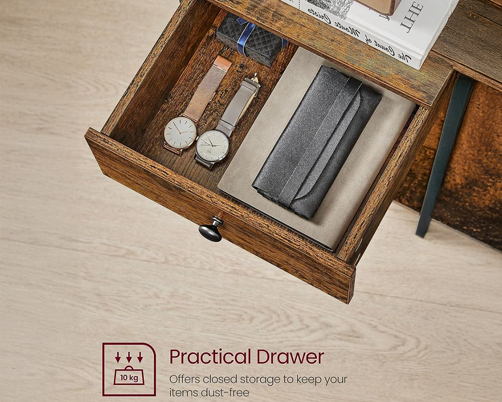 Upgrade your living space with this VASAGLE Rustic Brown Side Table. Perfect as a sofa end table or bedside nightstand, this side table blends classic design with practical storage. With a spacious drawer and bottom shelf, the side table keeps essentials organized while the adjustable feet ensure stability on uneven floors. This versatile side table adds charm and convenience to any room.