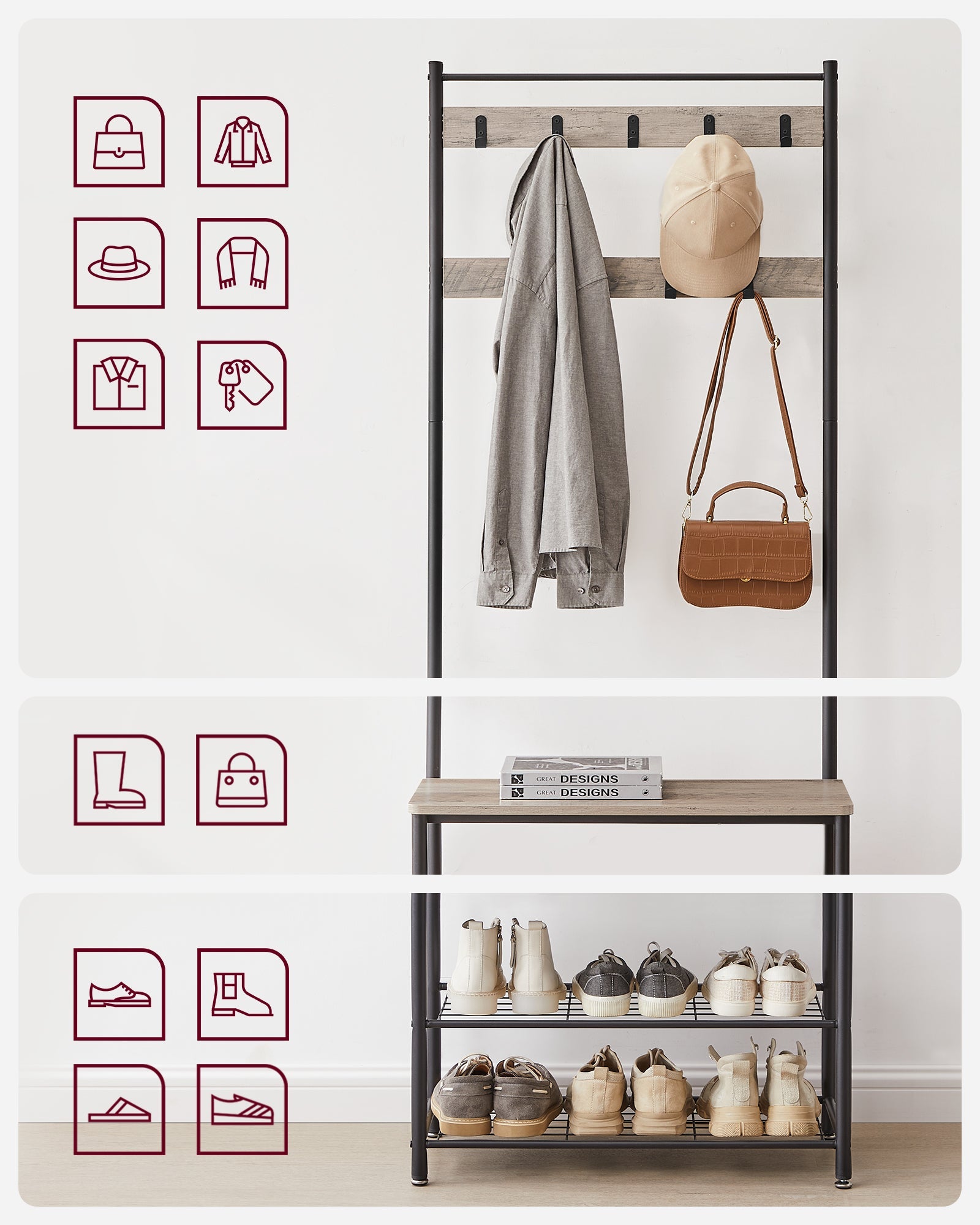 Organize your entryway in style with the VASAGLE Industrial Hall Tree Coat Rack and Shoe Rack Bench, designed to combine seating, storage, and hanging space in one elegant piece. With rustic greige panels, a black steel frame, and a compact design, this Coat Rack and Shoe Rack Bench adds charm and functionality to your home while keeping clutter under control.
