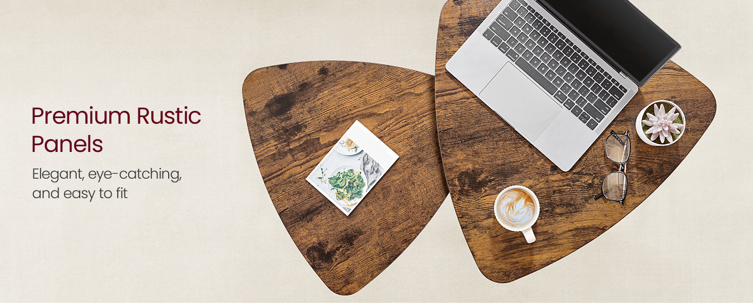 VASAGLE Nesting Triangle End Tables, Coffee Tables for Living Room Bedroom, Industrial Accent Stacking Side Tables with Metal Frame, Rustic Brown and Black ULET013B01, 21.7" x 17.9" x 20.7", Set of 2