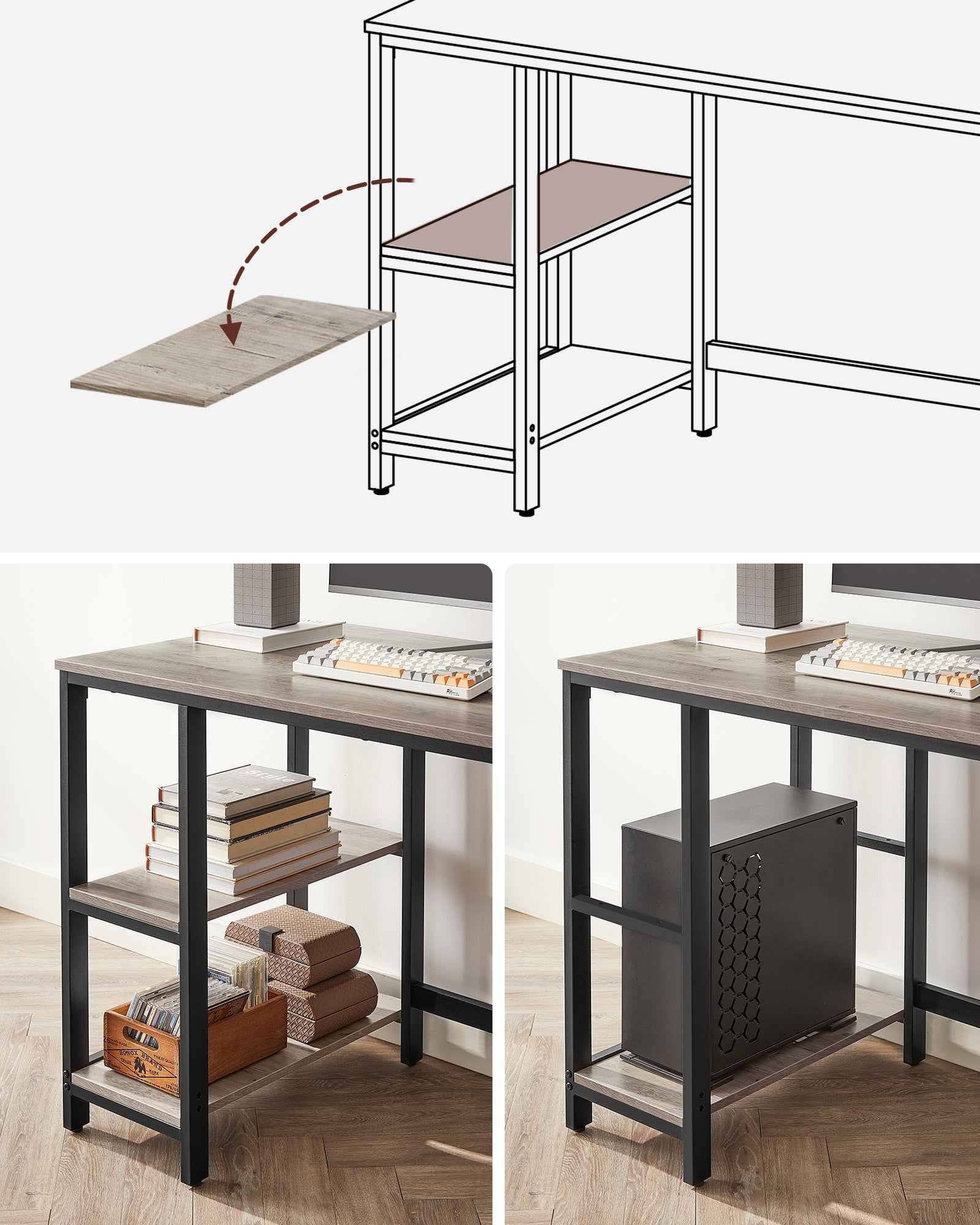 - Flexible 2-Tier Storage: Two open shelves provide space for books, files, or accessories. The middle shelf can be removed to fit a PC tower, making the computer desk adaptable.