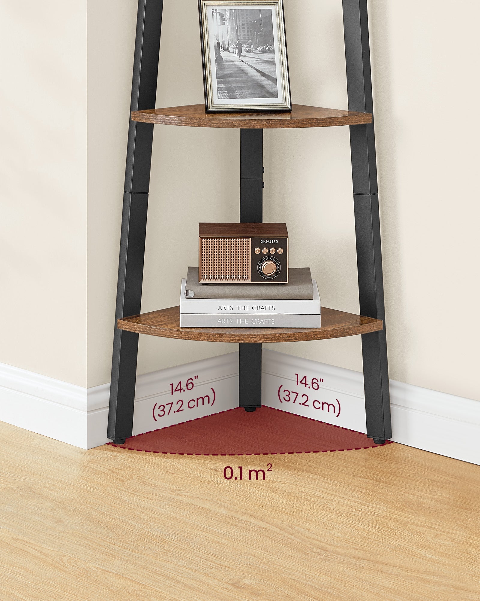 - Vintage Industrial Style: A matte black steel frame meets rustic brown shelving for a charming industrial design. This Corner Shelf effortlessly complements your existing furniture while adding a bold, modern touch.