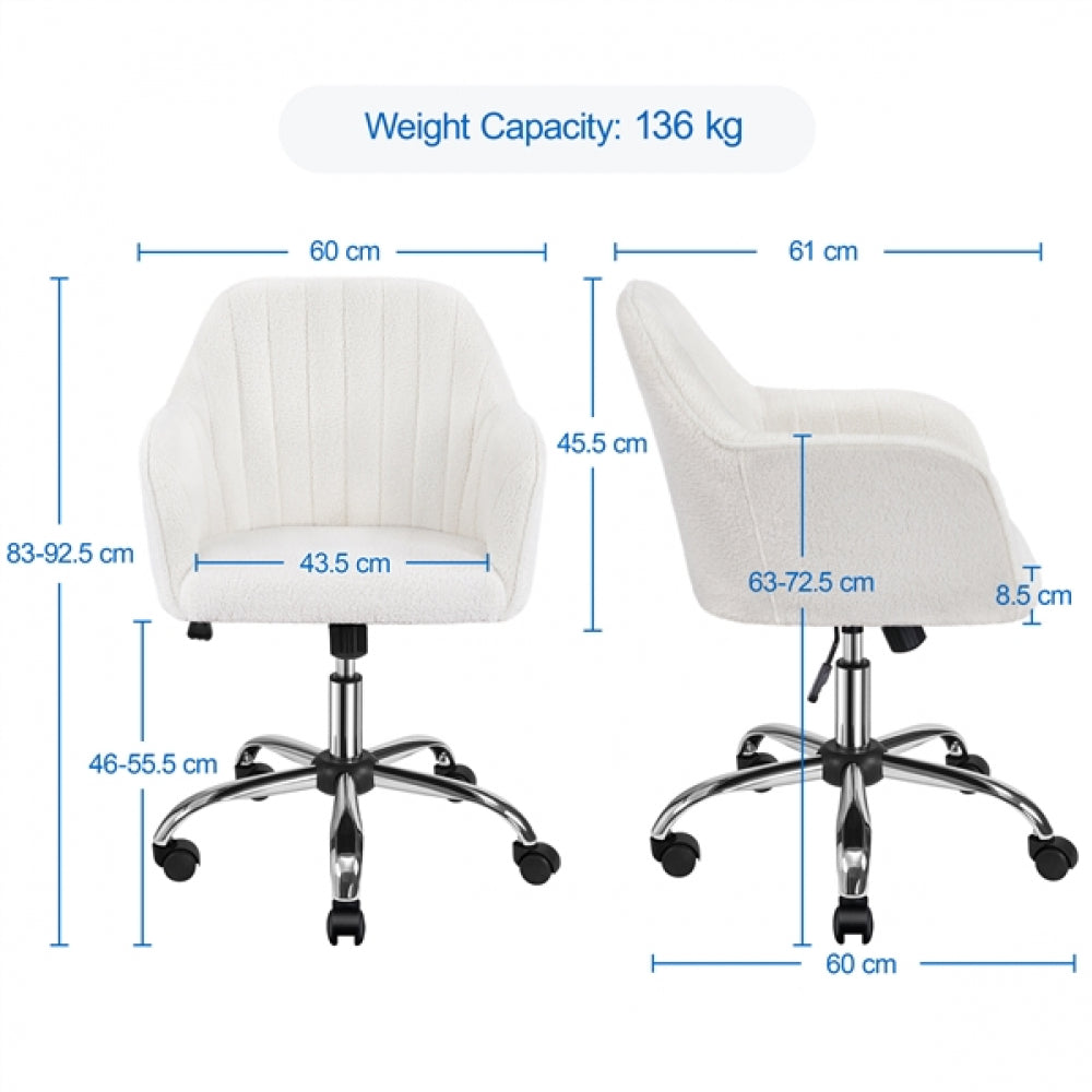 Color: Ivory Materials: velvet, foam, plywood, metal Overall dimension: 60 x 61 x 83-92.5cm/24 x 24 x 33-36.5” (L x W x H) The size of the seat: 59 x 58 x 47cm/23.2 x 23 x 18.4” (L x W x H) The size of the cushion: 43 x 43.5 x 8.5cm/17 x 17 x 3.3” (L x W x D) The size of star foot base (without wheels): radius: 30cm/12”, height: 10cm/4”; the adjustable height: 9.5cm/3.7” Max. weight capacity: 136kg/300lb N.W.: 9.2kg/20.3lb G.W.: 12kg/26lb