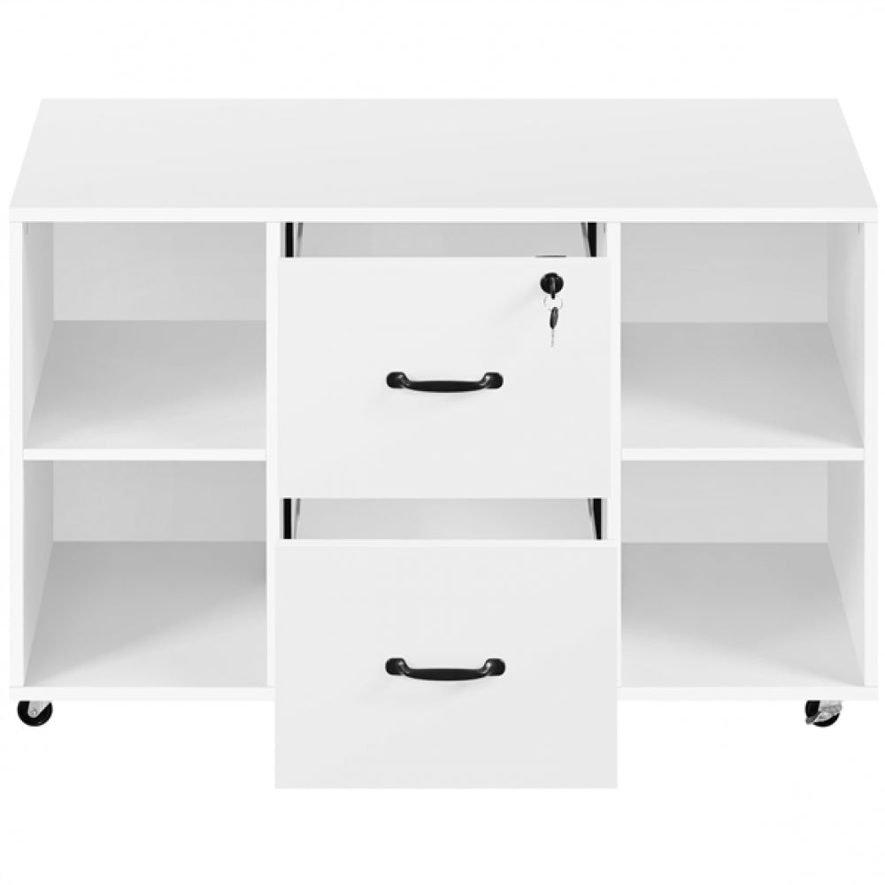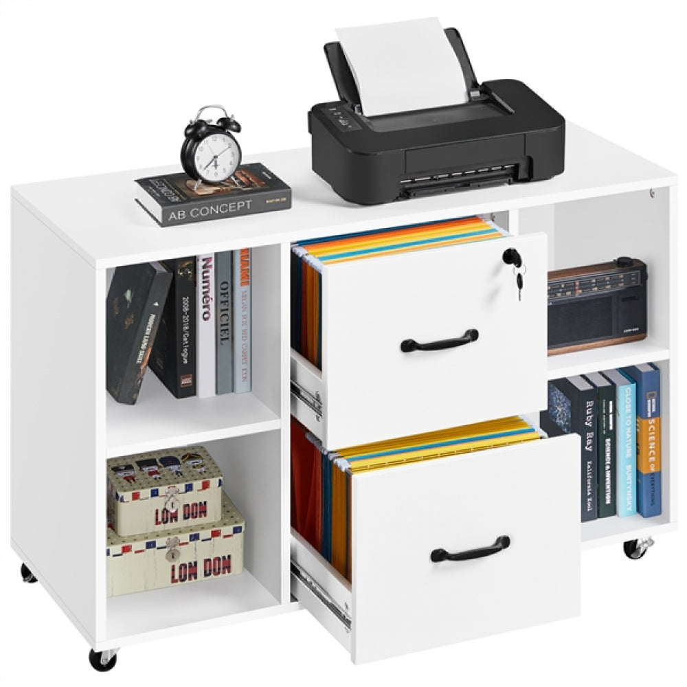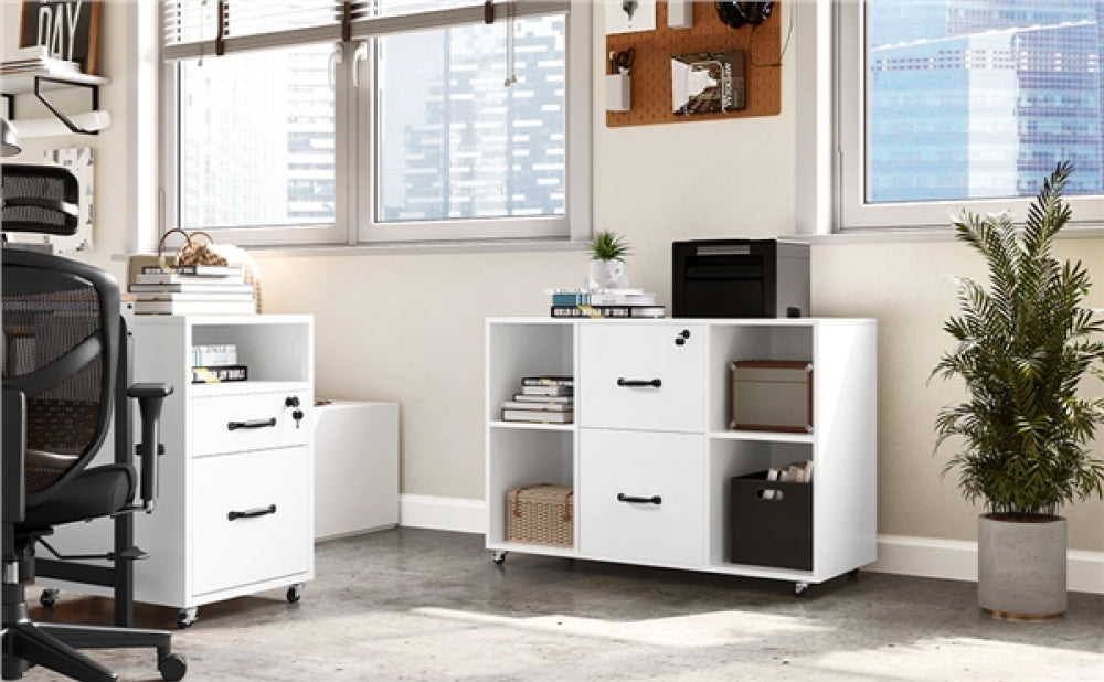 Two spacious drawers with file hanging rails can accommodate letter or A4 files, allowing your documents to be neatly organized and easily accessible. Four practical shelves provide extra storage or display space.