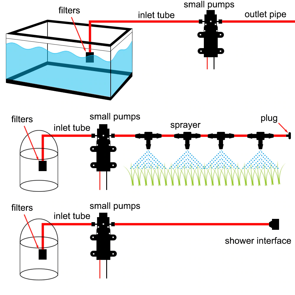 This pump is ideal for a wide range of applications, including sprayer fixtures, clean machines, humidifiers, water purification, medical apparatus, and auto pressurized water systems for yachts, boats, caravans, motor homes, industry, RVs, marine, and agriculture pumps. It is also perfect for car washes, deck washes, showering, toilets, and vanity applications, as well as agriculture high-pressure sprinkler irrigation equipment.