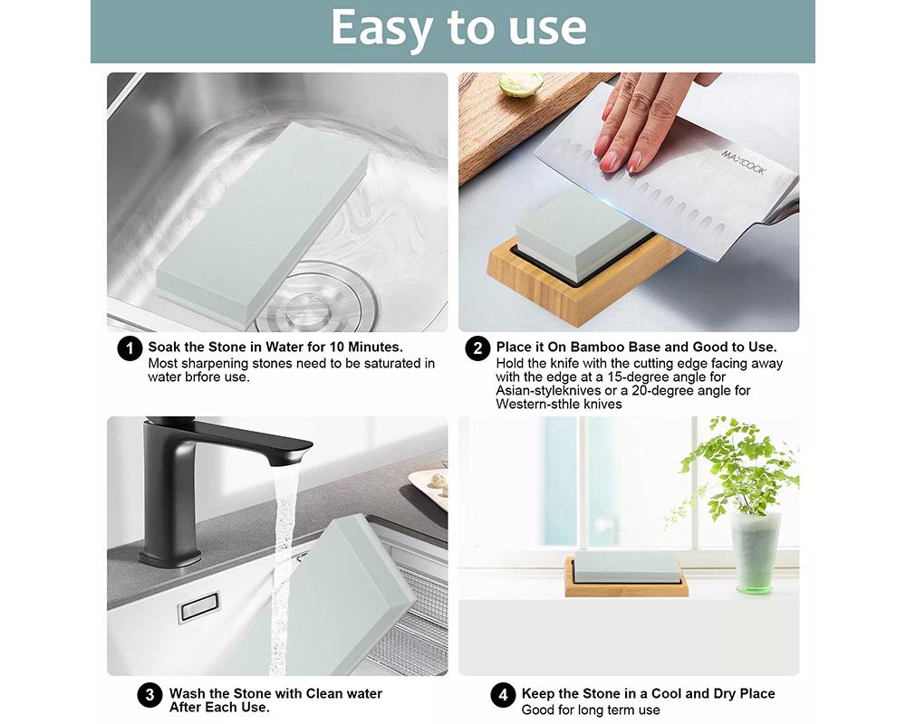 - Non-slip bamboo base with silicone holder ensures stability while sharpening, plus cut-resistant gloves for added safety.