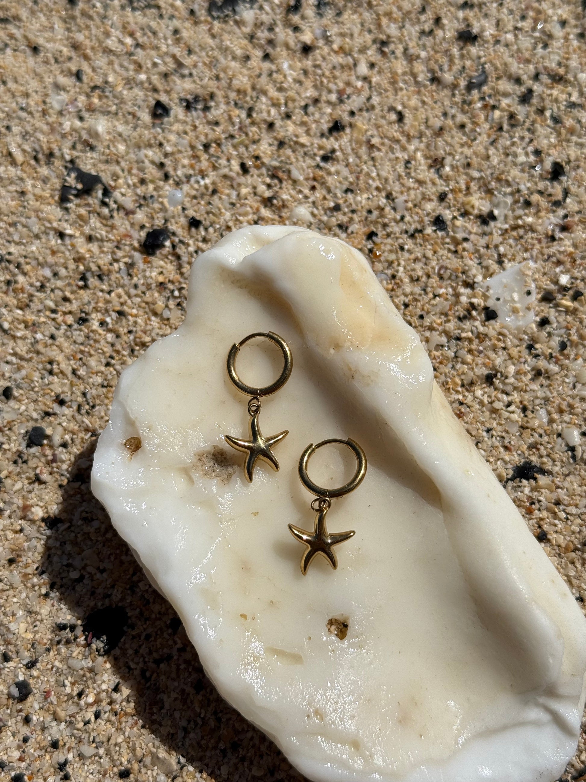 Crafted with gold toned huggie hoops and adorned with a shimmering starfish charm, these earrings blend elegance with meaning.