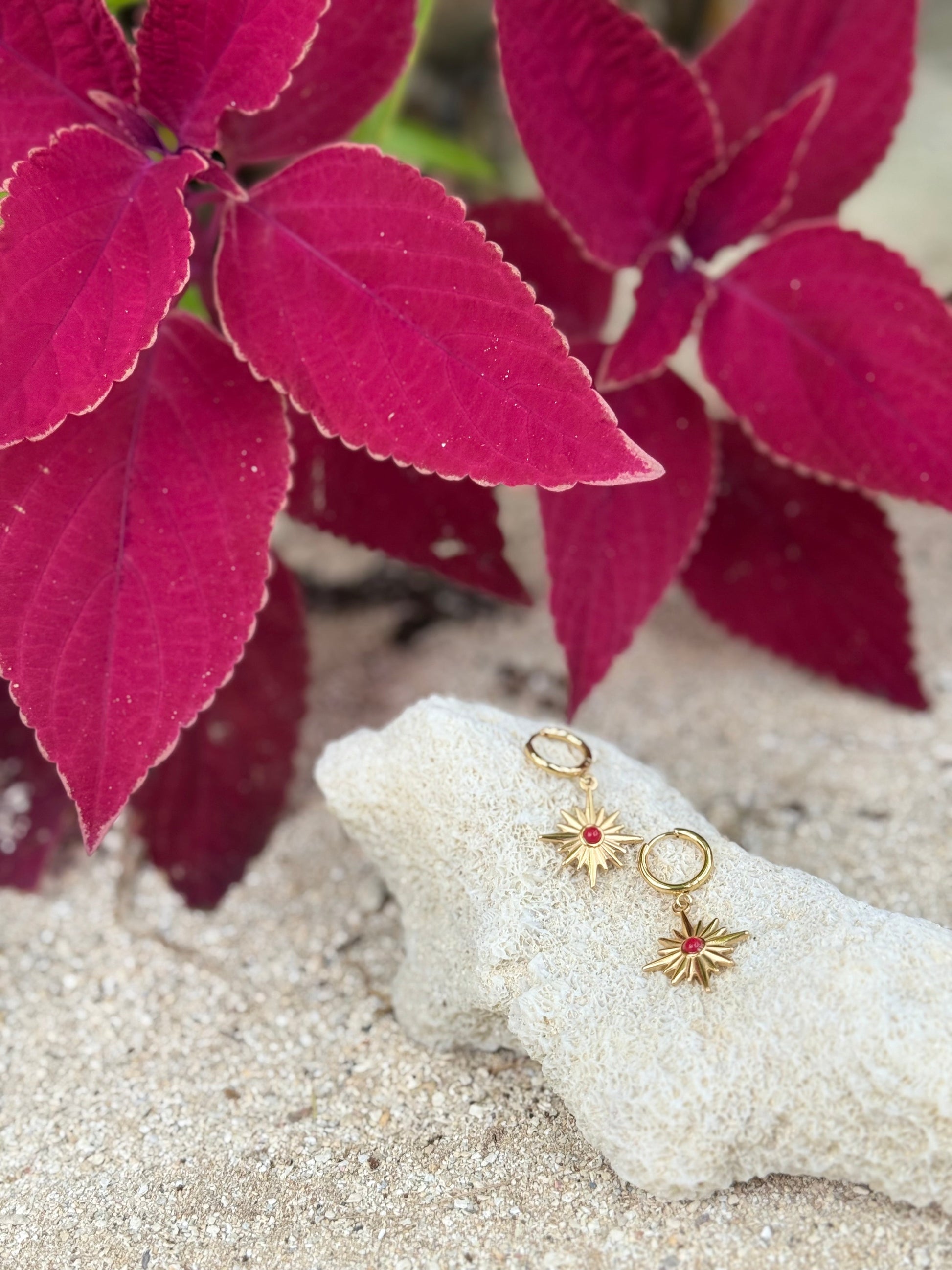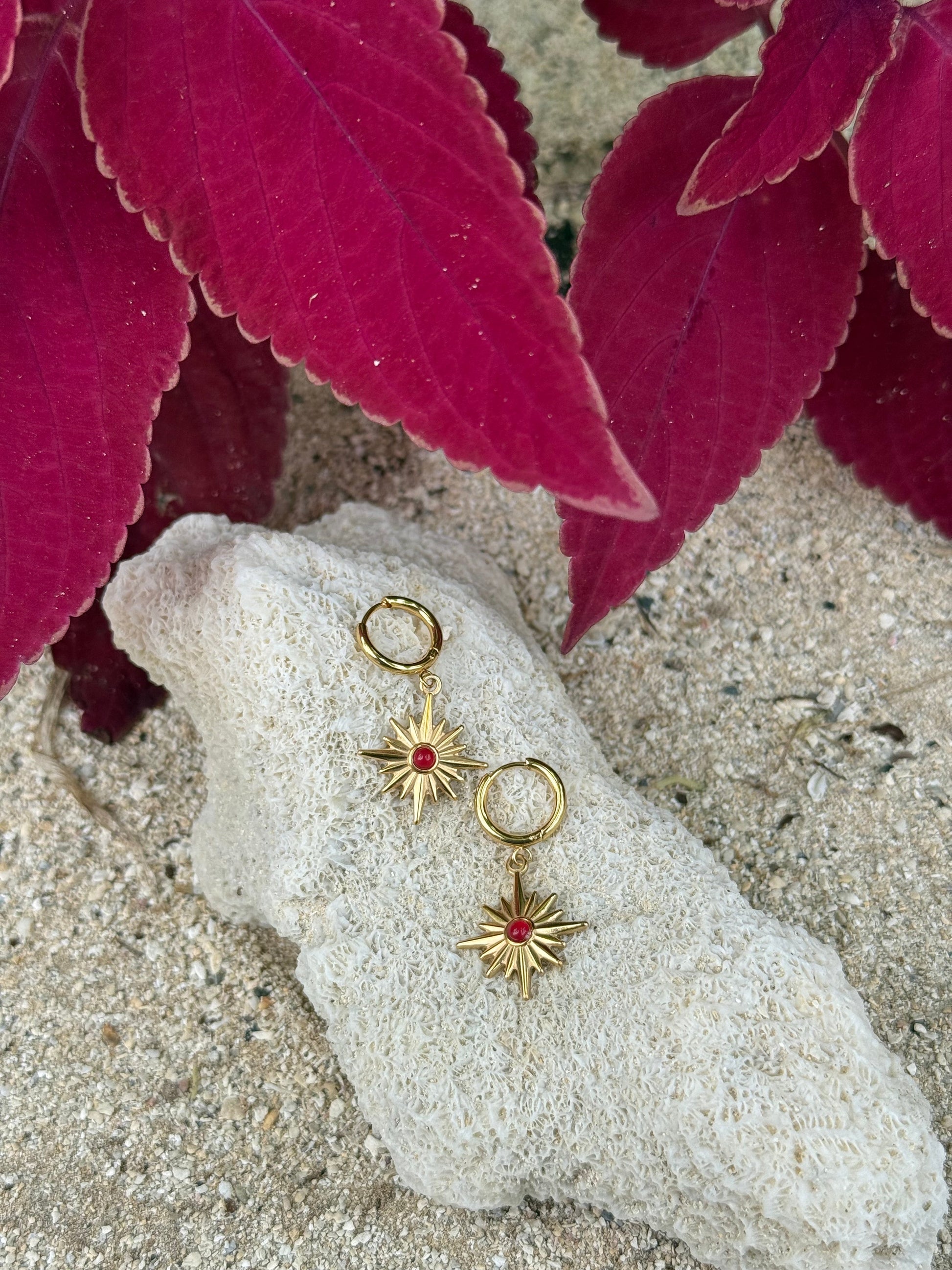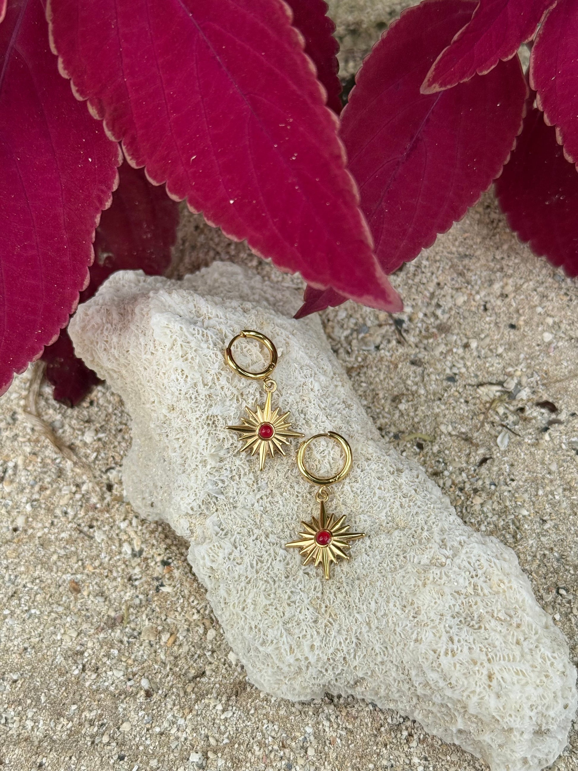 Radiant and bold, the Whetū Whero Gold Huggies ignite with the fire of the rising sun and the strength of generations. A brilliant red stone sits at the heart of a golden whetū, symbolising passion, guidance, and unwavering light.