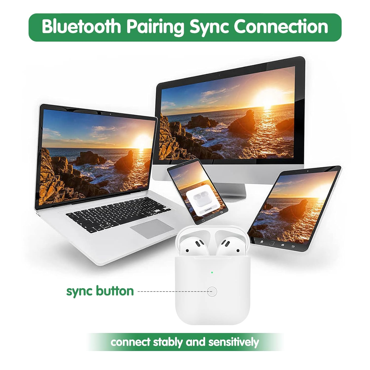 -Support Bluetooth Pairing:Our charging case has a bluetooth pairing sync button.