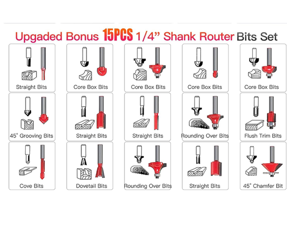 - 15PCS Milling Cutters: Comes with 15 precision router bits featuring sharp tungsten carbide blades, ideal for edging, trimming, grooving, and shaping materials like solid wood, MDF, plywood, and particleboard. Includes a durable wooden case for storage.