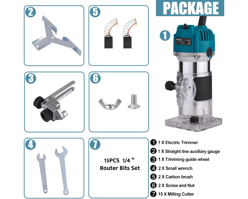 Electric Hand Wood Router Trimmer – 800W Palm Router with 15PCS Milling Cutters, Linear Guide & Edge Trimming Tool